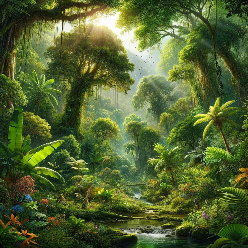 In the heart of this vibrant jungle, lush green foliage flourishes, enveloping towering trees in a dense embrace. The canopy overhead forms a verdant umbrella, filtering sunlight into scattered specks that dance upon the forest floor. Amidst the greenery, life thrives in a symphony of vibrant colors and diverse forms, creating a mesmerizing tableau of nature’s abundance and beauty.