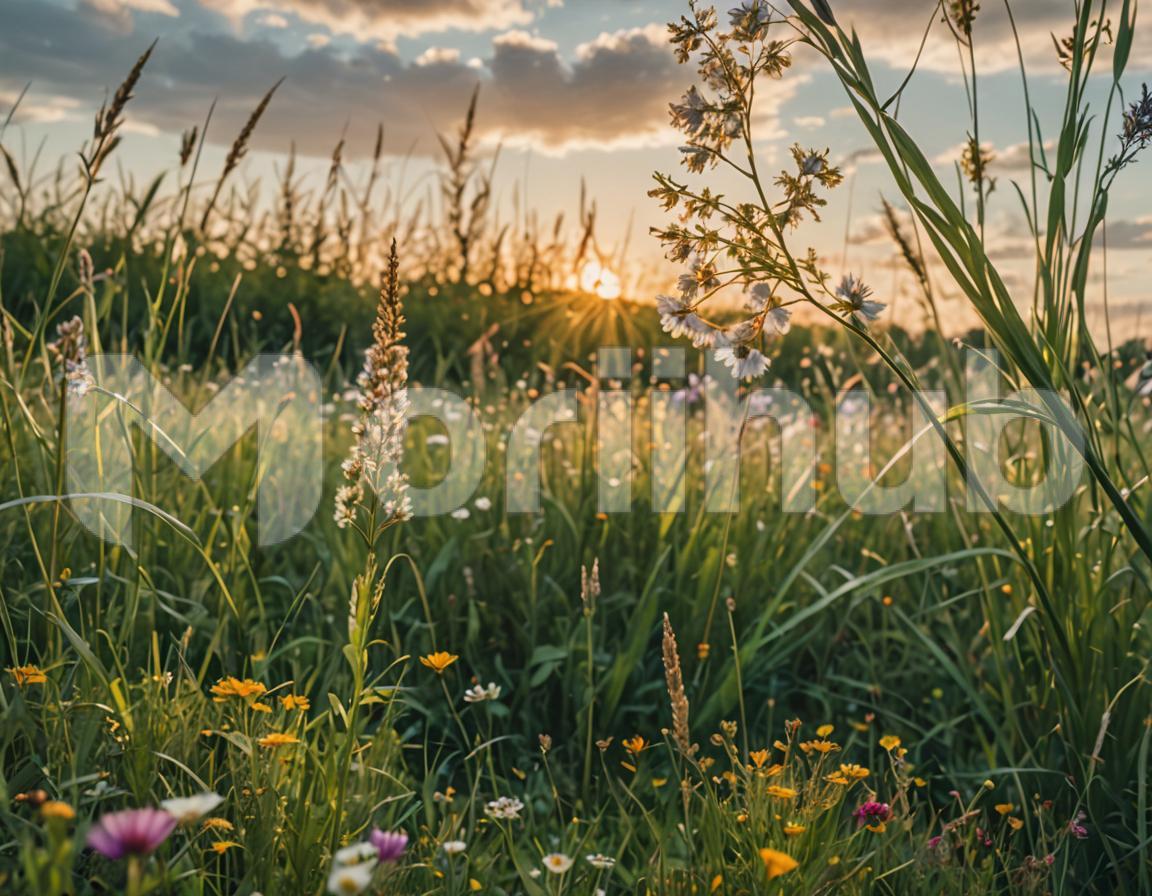 The morning sun, low in the sky, casts long, delicate shadows that dance across the open field, creating a tapestry of light and shade. Dew-kissed wildflowers sparkle like tiny jewels, their petals opening to greet the warmth of the day. A gentle breeze stirs the air, carrying with it the sweet scent of blooming flowers and fresh earth. The entire landscape is alive with a quiet, peaceful energy, as the sunlight touches everything with a tender warmth, turning the meadow into a haven of tranquility and natural beauty.