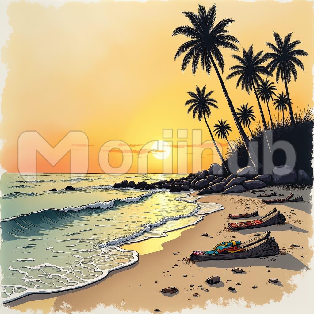The beauty of the beach is magnificently enhanced by the sunlit palm trees that line the shore, their tall, graceful forms swaying gently in the coastal breeze. As the golden rays of the sun filter through the fronds, they cast intricate patterns of light and shadow on the soft sand below, creating a serene and picturesque landscape. The palms add a tropical charm, framing the crystal-clear waters of the ocean that stretch endlessly toward the horizon. The vibrant green of the palm leaves contrasts beautifully with the deep blues of the sea and sky, making the entire scene feel like a postcard-perfect paradise.