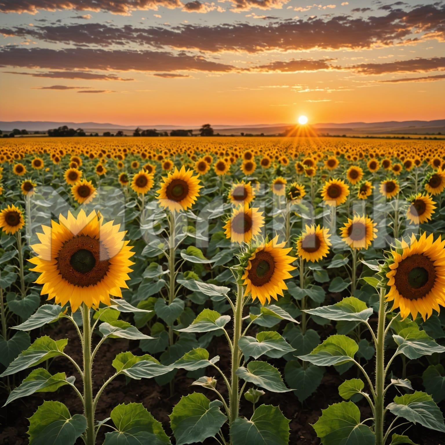 The sun sets along the horizon, casting a warm glow over a wide field of sunflowers. Each flower stands tall, facing forward, their broad heads steady under the soft light. Above, clouds drift across the sky in loose formations, some dense, others wispy, catching color as the sun lowers. The field stretches far, a quiet pattern of blooms beneath the changing sky. The line where land meets sky is clear, touched by fading light. The scene holds a calm rhythm, shaped by the flowers below and the cloud-filled sky above.