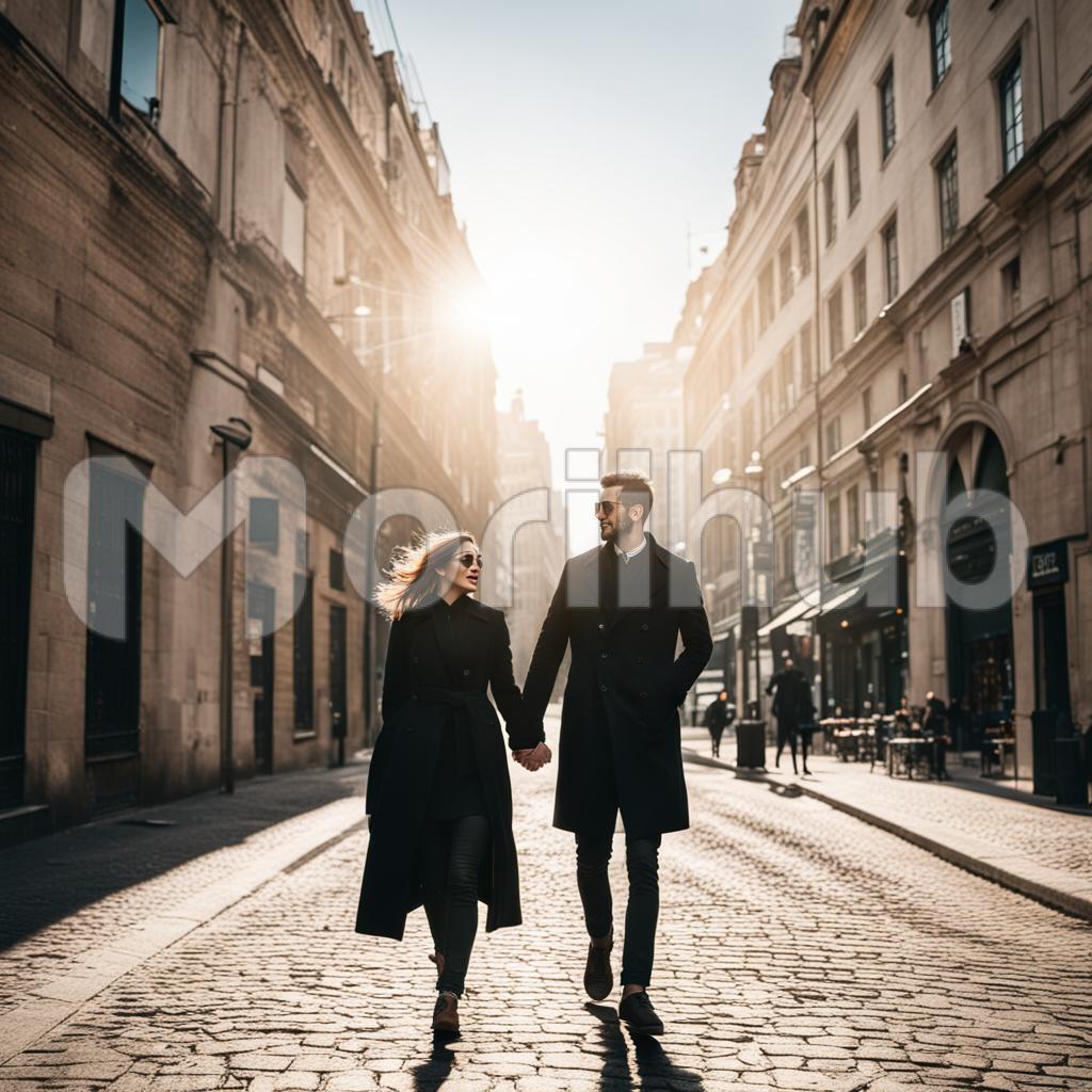 Amid the urban tapestry, a young couple strolls hand in hand, adorned in matching black overcoats. Their stylish glasses reflect the radiance of the sun overhead. The wind tousles the male’s trimmed beard and gently ruffles their hair, adding a touch of spontaneity to their stride. The couple’s synchronized steps and shared warmth create a tableau of modern romance, where love blossoms against the city backdrop, bathed in sunlight and cocooned in the embrace of matching overcoats.