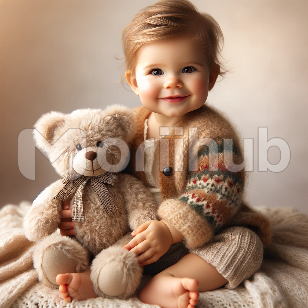 In a cozy nursery bathed in warm, gentle light, a heartwarming scene unfolds. A chubby, rosy-cheeked baby, with a radiant smile that could melt anyone’s heart, sits comfortably on a soft, pastel-colored bed. In those tiny, delicate hands, the baby clutches a plush, fluffy teddy bear, their closest confidant. The teddy bear’s kind, button eyes seem to mirror the baby’s joy, creating a timeless image of pure innocence and boundless love.