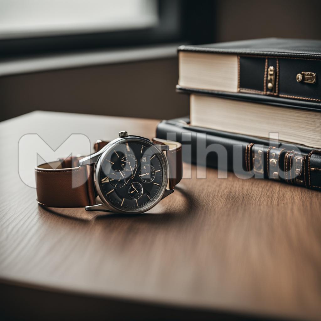 A sleek watch rests elegantly on a table, its polished metal glinting softly. Beside it, a trio of books stand in perfect alignment, their spines forming a colorful tower. The watch, a symbol of time’s precision, contrasts with the knowledge encapsulated in the neatly stacked books. The tableau captures a moment where time and intellect converge, inviting contemplation and reflection in the harmonious arrangement of these two artifacts.