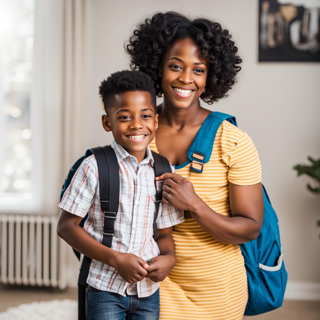 In the soft morning glow, a heartwarming scene unfolds as a happy black mother captures a precious moment with her beaming son, all set for school. The mother’s eyes sparkle with pride and love as she holds up a camera to freeze this joyous instance. The boy, dressed in his school uniform, radiates enthusiasm and readiness for the day ahead. His genuine smile reflects the excitement of a new adventure. The backdrop exudes warmth and familiarity, perhaps their home or the doorstep. It’s a snapshot of shared happiness, a testament to the bond between mother and son. In this tender tableau, the air is filled with anticipation and the promise of a day filled with learning and laughter.