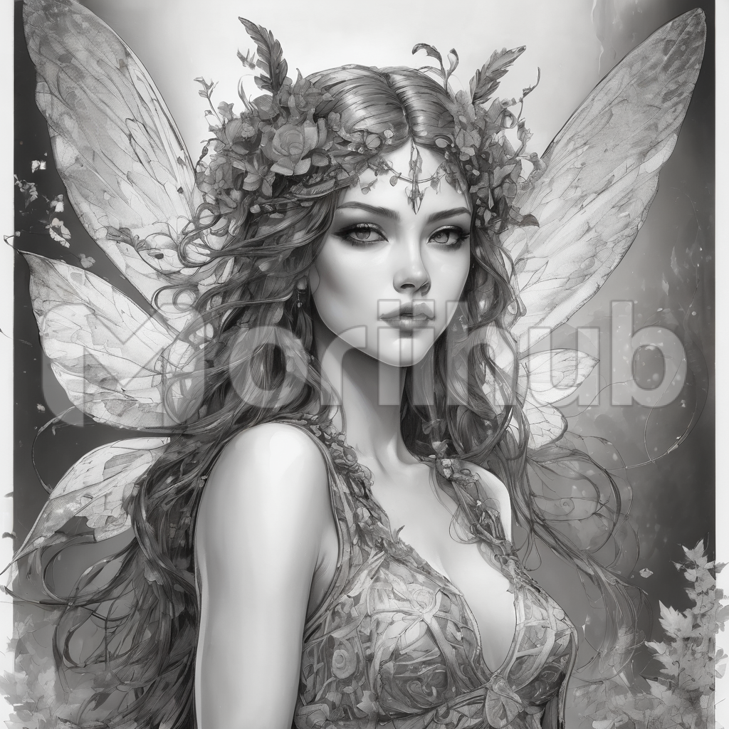 A mystical enchantress captivates the beholder with her ethereal allure. Butterfly wings adorn her graceful form, delicate and vibrant, while a wreath of blooming flowers graces her head. Her gaze, both enigmatic and serene, is fixed upon the horizon, as if divining secrets of the unseen. She embodies the union of nature’s beauty and mystical grace, an enchanting presence that beckons one to embrace the wonders of the unknown.