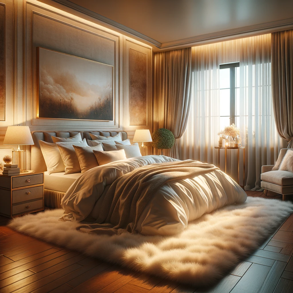 In this cozy haven, soft, warm lighting bathes the well-decorated bedroom, casting a gentle glow that invites relaxation. A large, sumptuous bed takes center stage, adorned with fluffy pillows and a thick, inviting duvet, promising luxurious comfort. The room exudes an ambiance of serenity and tranquility, creating a perfect sanctuary for rest and rejuvenation.
