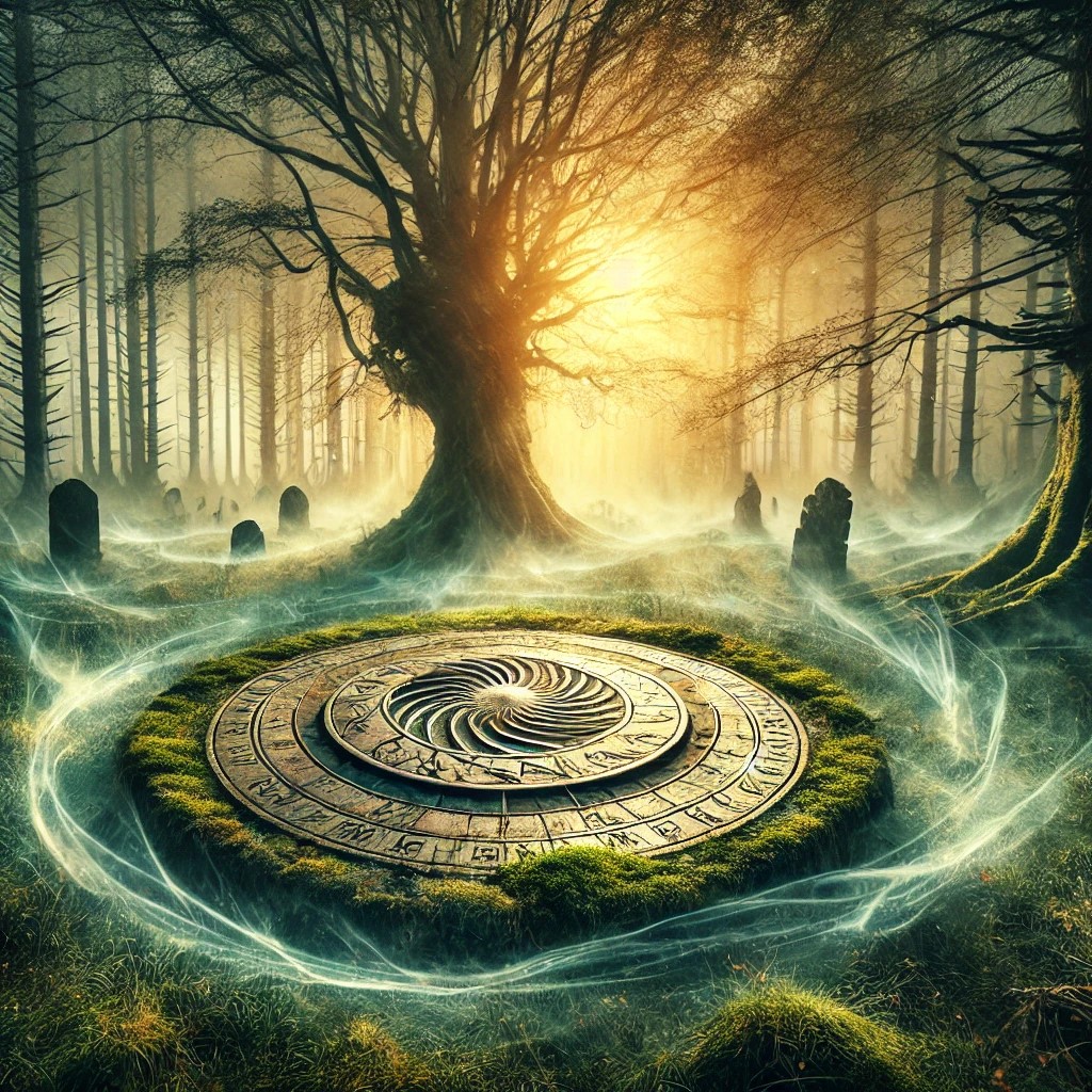 A time clearing within an ancient, mystical forest. The clearing is enveloped in swirling mists that glow with a soft, golden light, creating an impression that time itself is in flux. At the center stands an ancient, weathered sundial, covered in moss and intricately etched with symbols representing the passage of time. The surrounding trees blur at the edges, as if caught between different moments, with leaves suspended in mid-fall.