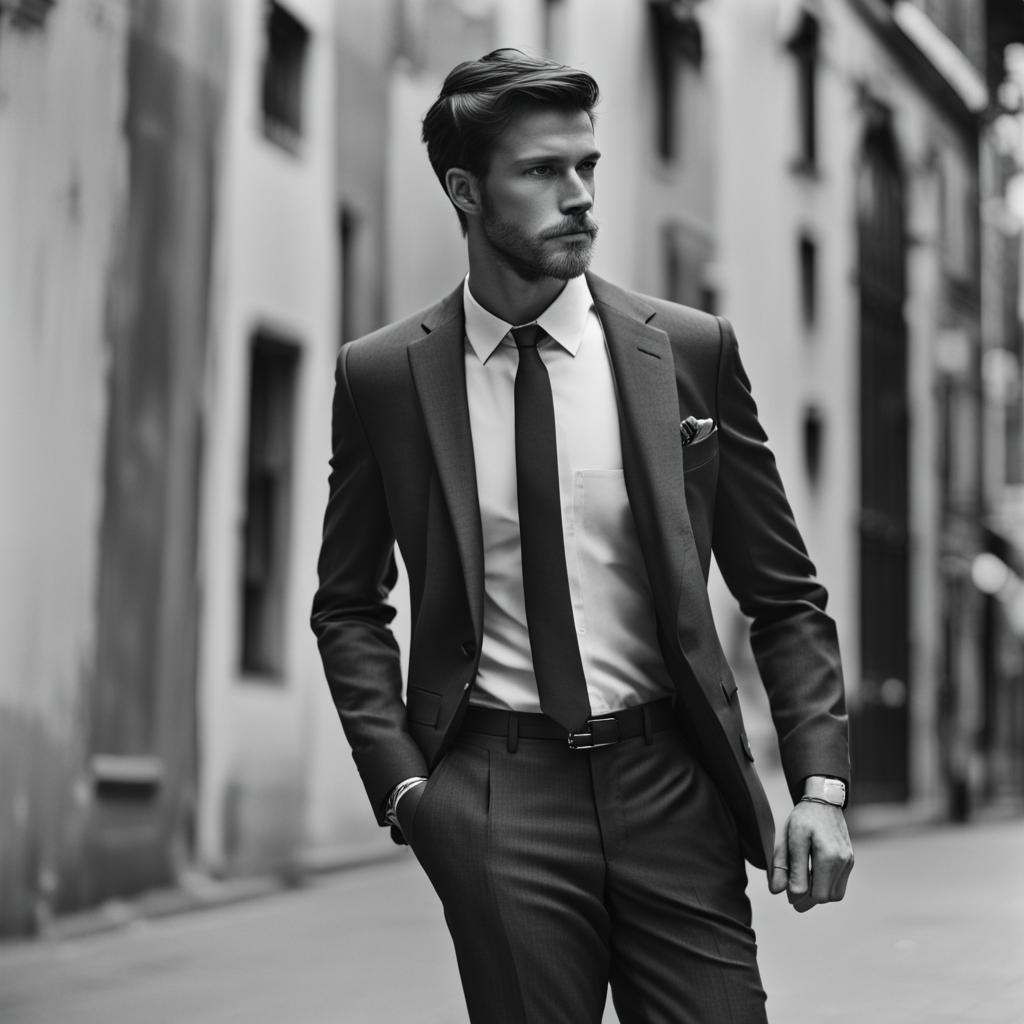 In a timeless black and white composition, a young man stands with effortless style against a backdrop of block buildings. Clad in a tailored suit, he exudes sophistication, one hand casually tucked into his pocket. His face, adorned with a neatly trimmed beard, projects confidence and modern elegance. The stark urban landscape provides a striking contrast, emphasizing the intersection of classic sartorial flair and contemporary cityscape, capturing a moment where fashion and architecture converge in a monochromatic visual narrative.