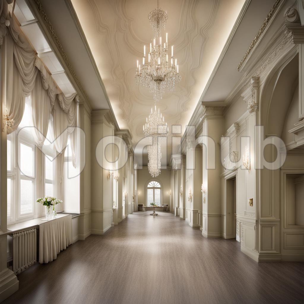 An exquisite hallway unfolds, a symphony of opulence and grandeur. Curtains drawn wide unveil a procession of towering windows, adorned with cascading drapes that pool gracefully on the marbled floor. Rows of majestic chandeliers hang from the ceiling, casting a warm glow that dances on polished surfaces. The interplay of natural light and the soft radiance from the chandeliers create an ambiance of timeless elegance. This hallway becomes a corridor of splendor, where luxury and sophistication intertwine, inviting those who traverse it into a world of refined beauty and architectural grace.