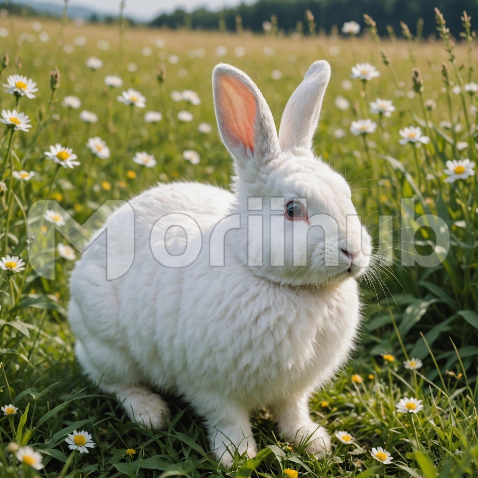 A cute bunny rests in a quiet meadow, its small body nestled among soft blades of grass. Its fur appears smooth and delicate, ears slightly raised as if listening to the whisper of the breeze. The air feels still, carrying the calm rhythm of nature around it. Tiny flowers bloom nearby, adding gentle life to the open field. The bunny’s eyes glimmer with innocence, reflecting peace and curiosity. In that tender moment, the meadow and its little guest share a silent harmony.