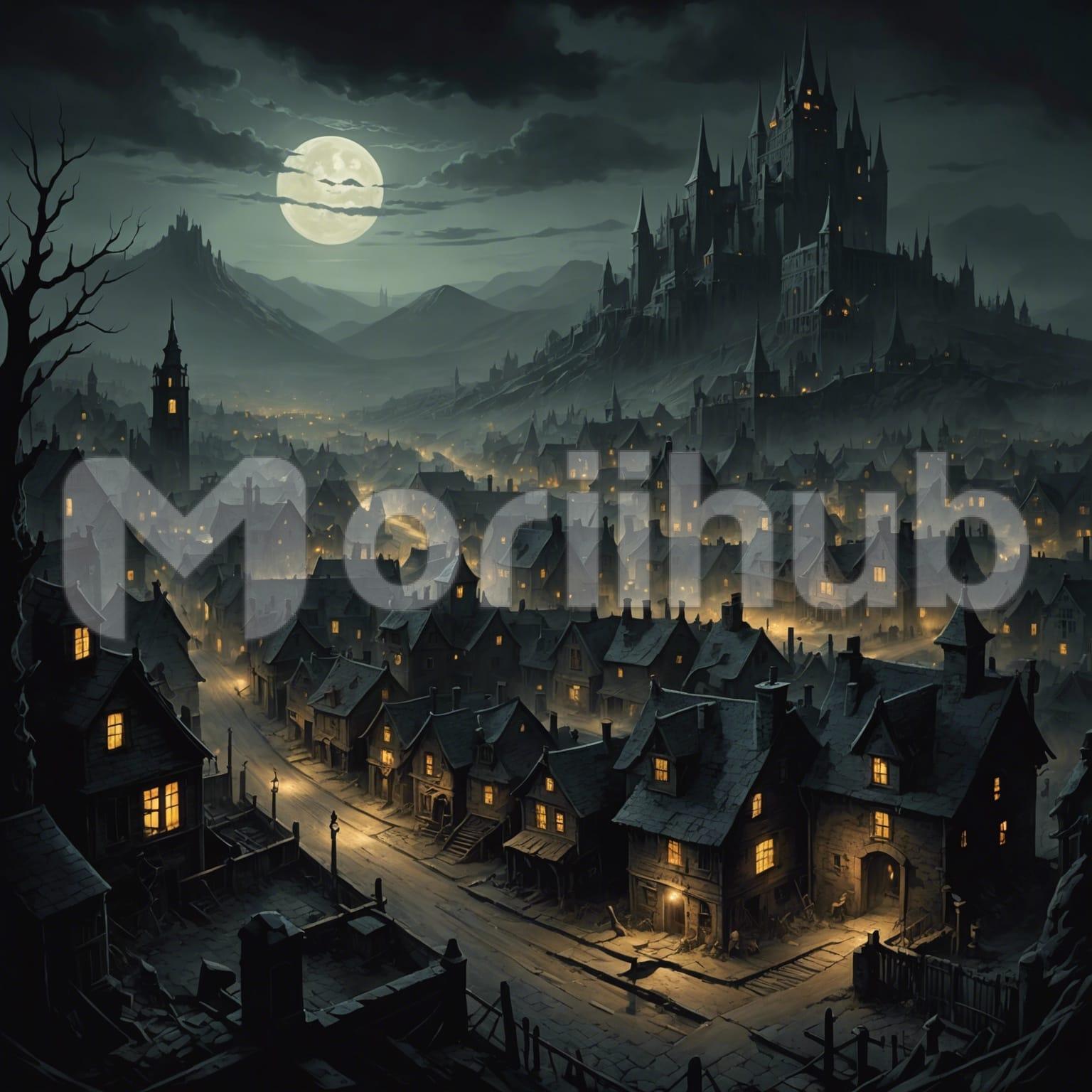 As night descends, the town glows with a warm luminance, its streets alive with twinkling lights. Buildings stand like sentinels, their windows illuminated with the flicker of life within. In the distance, atop a hill, the silhouette of a majestic castle watches over the town, its turrets reaching towards the starry sky. Shadows dance along the cobblestone streets, weaving tales of centuries past. In this nocturnal realm, the town sleeps peacefully under the watchful gaze of its ancient guardian, bathed in the gentle glow of moonlight.