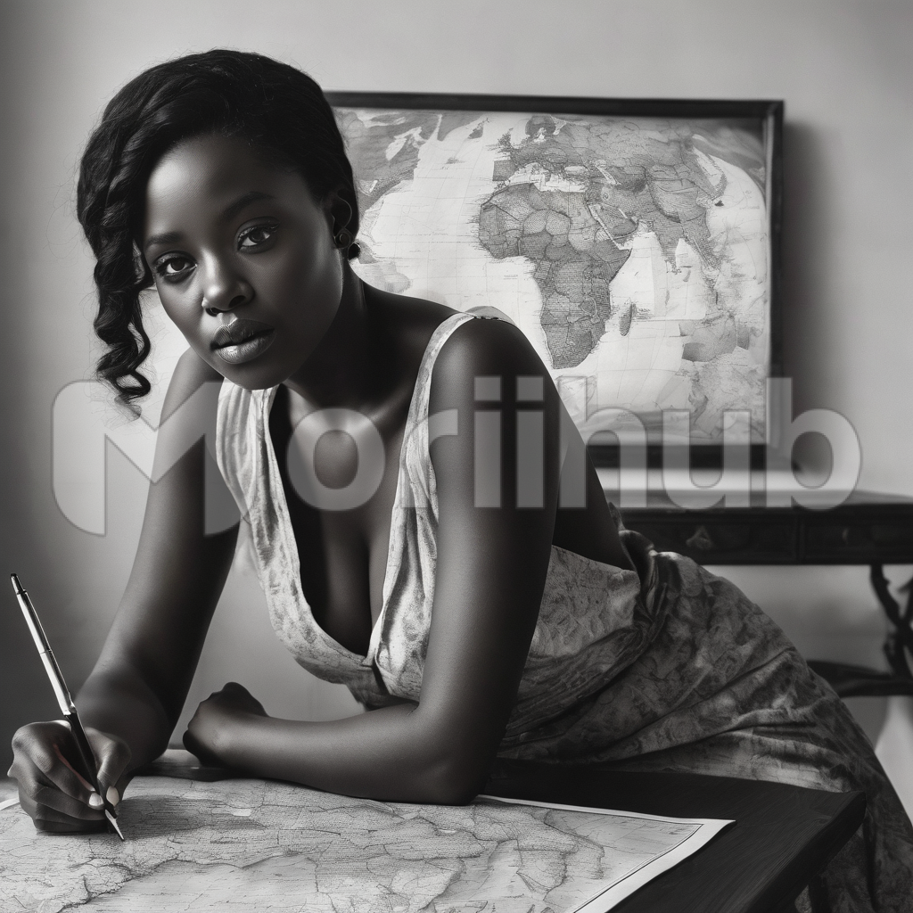 In a room, a beautiful black woman leans over a table, pen in hand, poring over a map spread before her. Her gaze is focused and determined, hinting at the adventure that awaits. The soft glow illuminates her features, highlighting the strength and grace in her posture. With a quiet confidence, she prepares to chart her course, ready to embark on a journey of discovery and exploration.