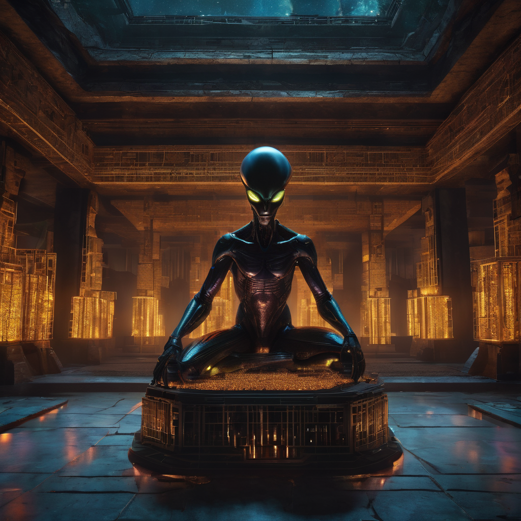 In the depths of a dimly lit chamber, an otherworldly being sits upon a raised platform, its form both alien and serene. Set against the darkness, it assumes a lotus position, its limbs arranged in perfect symmetry. With an aura of quiet contemplation, it emanates an enigmatic presence, its alien features hinting at wisdom beyond human comprehension. In this mysterious setting, the alien figure becomes a symbol of cosmic harmony and tranquility.