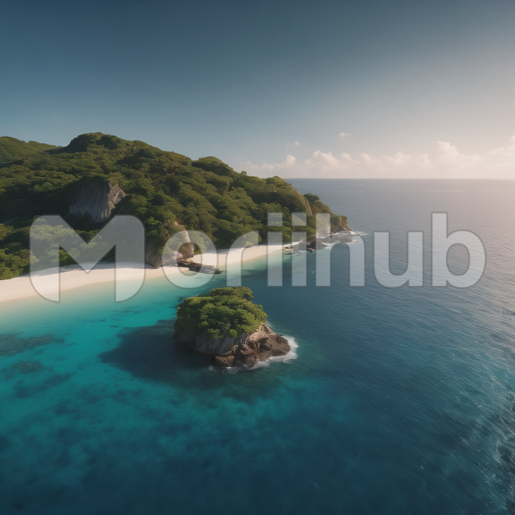 A picturesque vision unfolds as a lush island emerges from the cerulean embrace of the ocean. The vibrant, emerald-green foliage blankets the island’s rolling hills, inviting exploration. Against the canvas of a flawlessly clear sky, palm trees sway gently, their fronds a rhythmic dance. The tranquil seas cradle this verdant jewel, offering a serene backdrop to a scene that embodies the pristine beauty of nature’s harmony and coastal serenity.