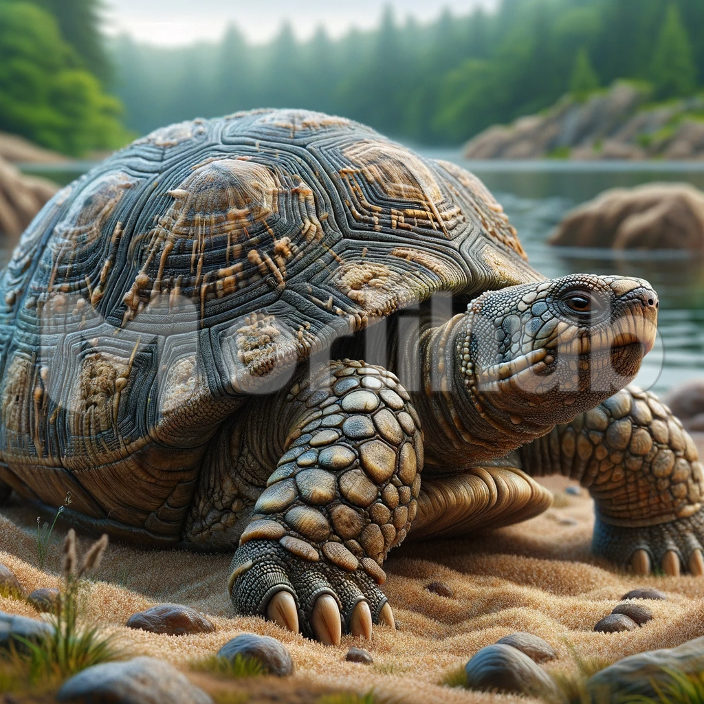 In this vivid, lifelike tableau, a majestic turtle basks in its natural habitat. The turtle’s aged and weathered shell, covered in intricate patterns, glistens in the sunlight. Its feet, bearing the marks of countless journeys, dig into the damp sand near a tranquil pond. Its eyes, reflecting wisdom earned over the years, gaze serenely into the distance. This exquisite scene captures the harmony of nature and the timeless beauty of this ancient creature.