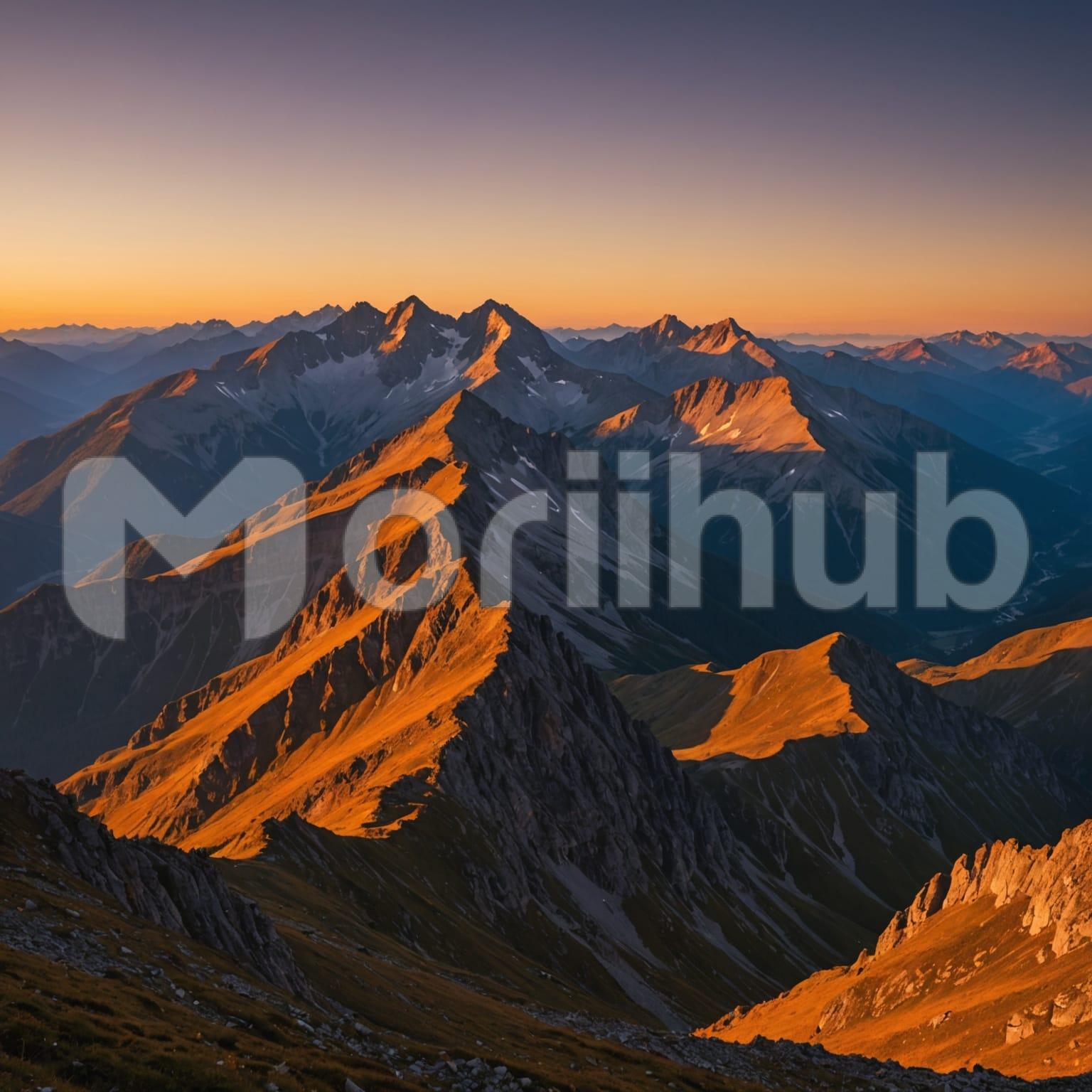Warm light settles over the mountains, outlining their slopes in steady, subdued glow. The ridges appear defined but softened, their forms held in quiet contrast against the sky. Above, the twilight sky stretches wide and clear, unbroken by clouds, offering an open expanse that meets the land without resistance. The light lingers low, not sharp, but present—close to the earth, without urgency. The scene holds stillness, where each shape remains undisturbed. The mountains and sky exist in balance, light and space joining without tension, forming a view shaped entirely by calm and clarity.