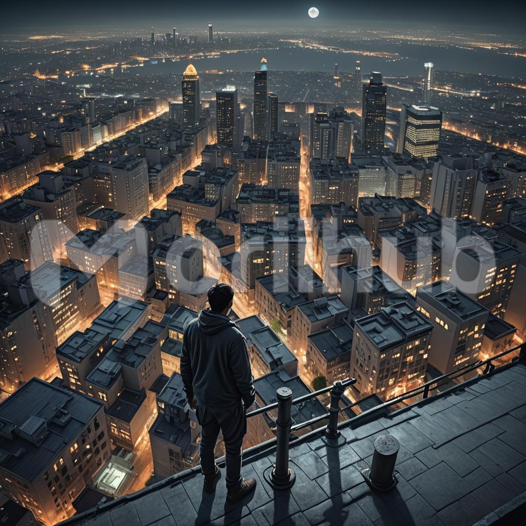 As twilight descends, a lone silhouette of a man stands atop a hill, gazing out at the sprawling city below. The sky is painted with shades of orange, pink, and purple, casting a mesmerizing glow over the urban landscape. Tall skyscrapers pierce the horizon, their windows twinkling like stars in the gathering dusk. The man’s posture is contemplative, hands in pockets, as he takes in the vastness of the city that never sleeps.