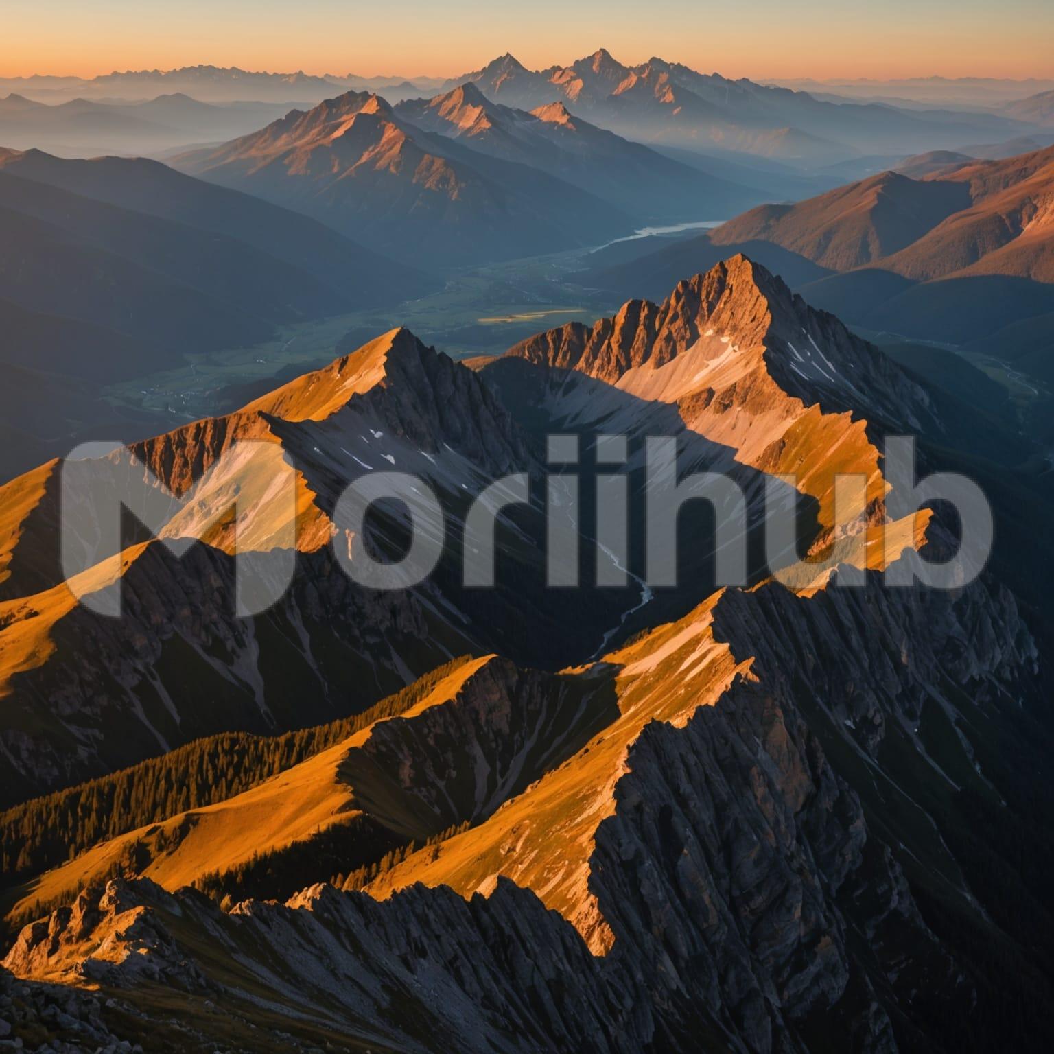 A warm evening glow settles over the mountains, casting gentle light along their slopes. The rugged outline of each ridge is softened beneath the golden hue, with cloud formations stretched above, tinged at the edges. Layers of peaks recede into the distance, each one slightly fainter, as if blending into the stillness. The clouds drift with no urgency, their shapes scattered across the sky. Light clings to the higher elevations, leaving the lower valleys already dim. The air feels calm, the moment quietly balanced between day and night.