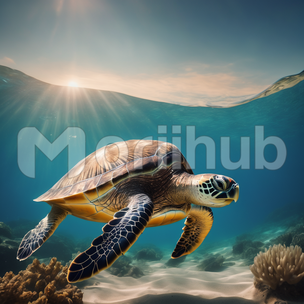 Beneath the ocean’s surface, a serene tableau unfolds as a turtle glides gracefully through the azure water. Sunlight pierces the depths, casting a shimmering glow on the majestic creature’s carapace. The turtle moves with unhurried elegance, navigating the currents with a timeless grace. The dance of sunlight creates an ethereal ambiance, turning the underwater world into a captivating spectacle where the turtle becomes a living gem, bathed in the radiant embrace of the ocean’s gentle rays.