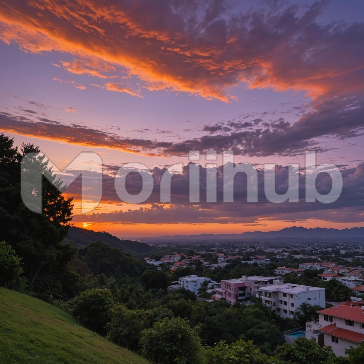 Greenery covers the slope in uneven patterns, spreading downward with natural variation. The incline fades into the distance where buildings stand, small and set apart, their lines steady against the land. The view remains clear and unobstructed, giving space to the separation between slope and settlement. Overhead, clouds move across the evening sky, their forms broad and shifting. Light fades gently from above, softening without sharp contrast. The entire scene feels grounded and still, with nothing hurried—just distance, open air, and the quiet descent of light.