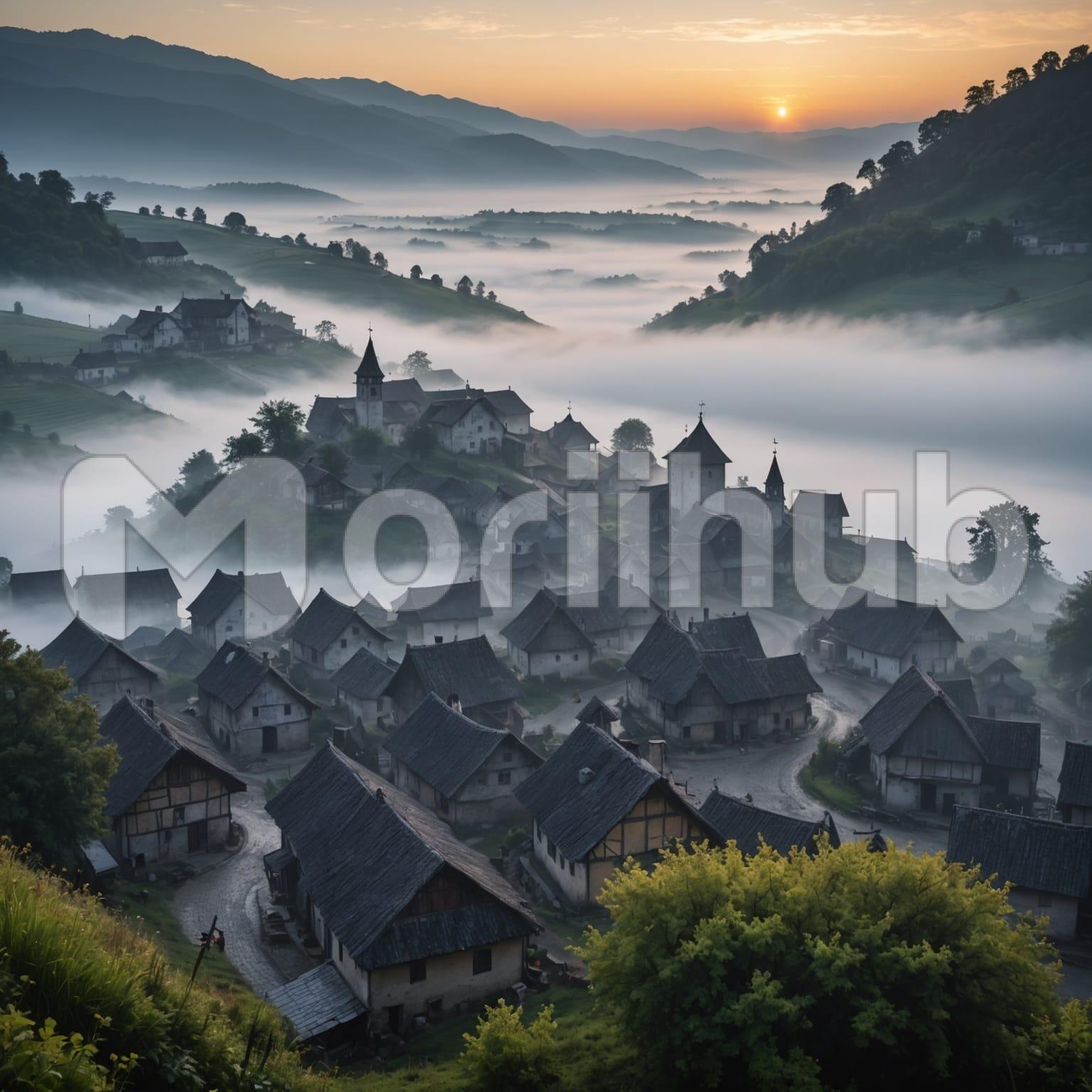 A small village rests quietly at the base of low hills, its rooftops grouped closely beneath a pale morning sky. The houses, compact and quiet, appear partly veiled by drifting mist that moves between the distant slopes. The hills beyond are faint and layered, giving a sense of depth without drawing too much attention. A cool stillness hangs over the entire view, holding everything in a soft pause. There are no sharp lines or bold contrasts—just the gentle rise of the land and the settled hush of early light.