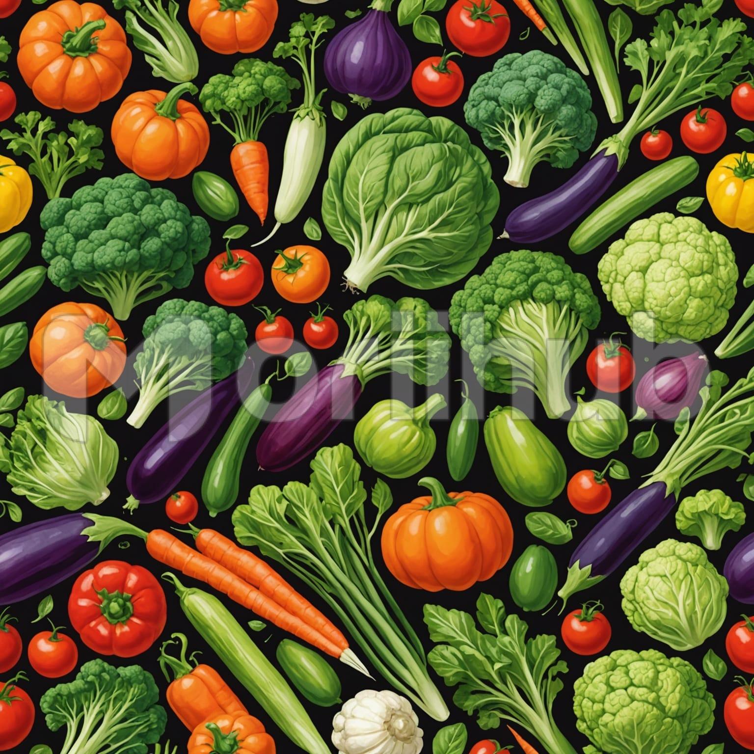 A colorful collage of vegetables bursts with life, each meticulously painted to capture its vibrant essence. Plump tomatoes shine with a luscious red, while carrots glow in varying shades of orange. Cauliflowers display intricate patterns of creamy white florets, and glossy purple eggplants add a deep, contrasting hue. The painting celebrates the diversity and beauty of nature’s bounty, each vegetable meticulously rendered to highlight its unique shape and texture. This artistic display invites admiration for both the artistic skill and the wholesome allure of fresh produce.