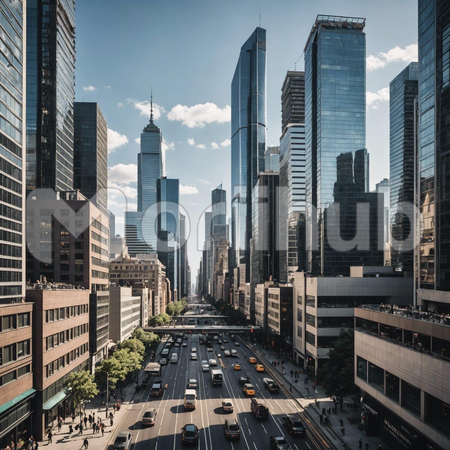 Under the bright canvas of day, the cityscape unfolds with vibrant energy. Vehicles traverse the sun-drenched streets, their colors a kaleidoscope against the asphalt. Towering buildings stand tall, their facades gleaming in the sunlight. Sparse clouds dot the expansive blue sky, adding depth to the scene. Below, the city buzzes with activity, a symphony of honking horns and bustling crowds. In this radiant daylight, every detail is illuminated, from the gleaming skyscrapers to the bustling streets, painting a picture of urban vitality under the warmth of the sun.
