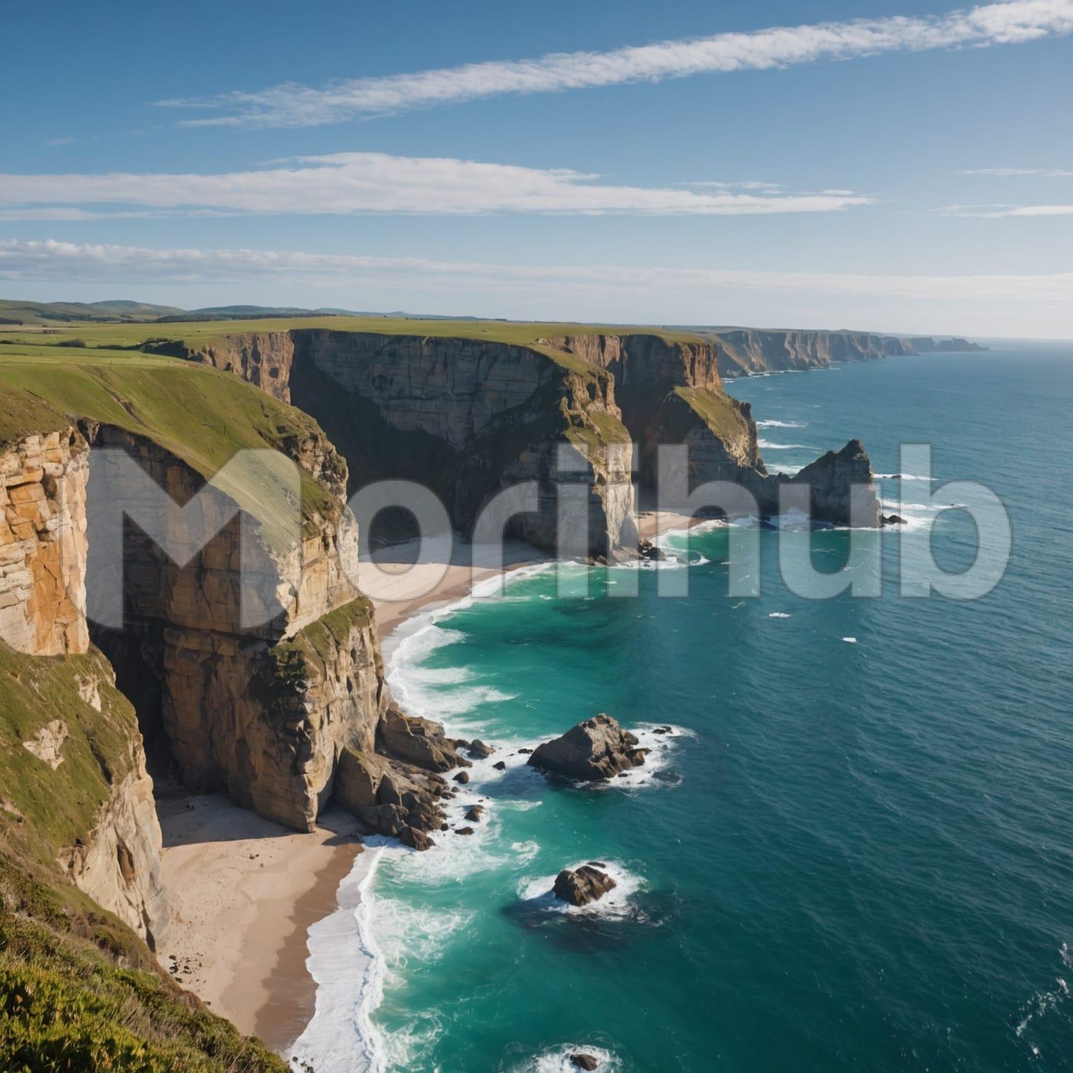 A high cliff overlooks the vast ocean, its rough surface touched by wind and time. Below, waves roll steadily, their motion endless and calm beneath the wide open sky. Sparse clouds drift lazily above, casting faint shadows that glide across the water. The air feels cool and light, carrying the distant rhythm of the sea. From the cliff’s edge, the horizon stretches far and clear, a quiet meeting of earth and water that feels both peaceful and infinite, a moment suspended in stillness.