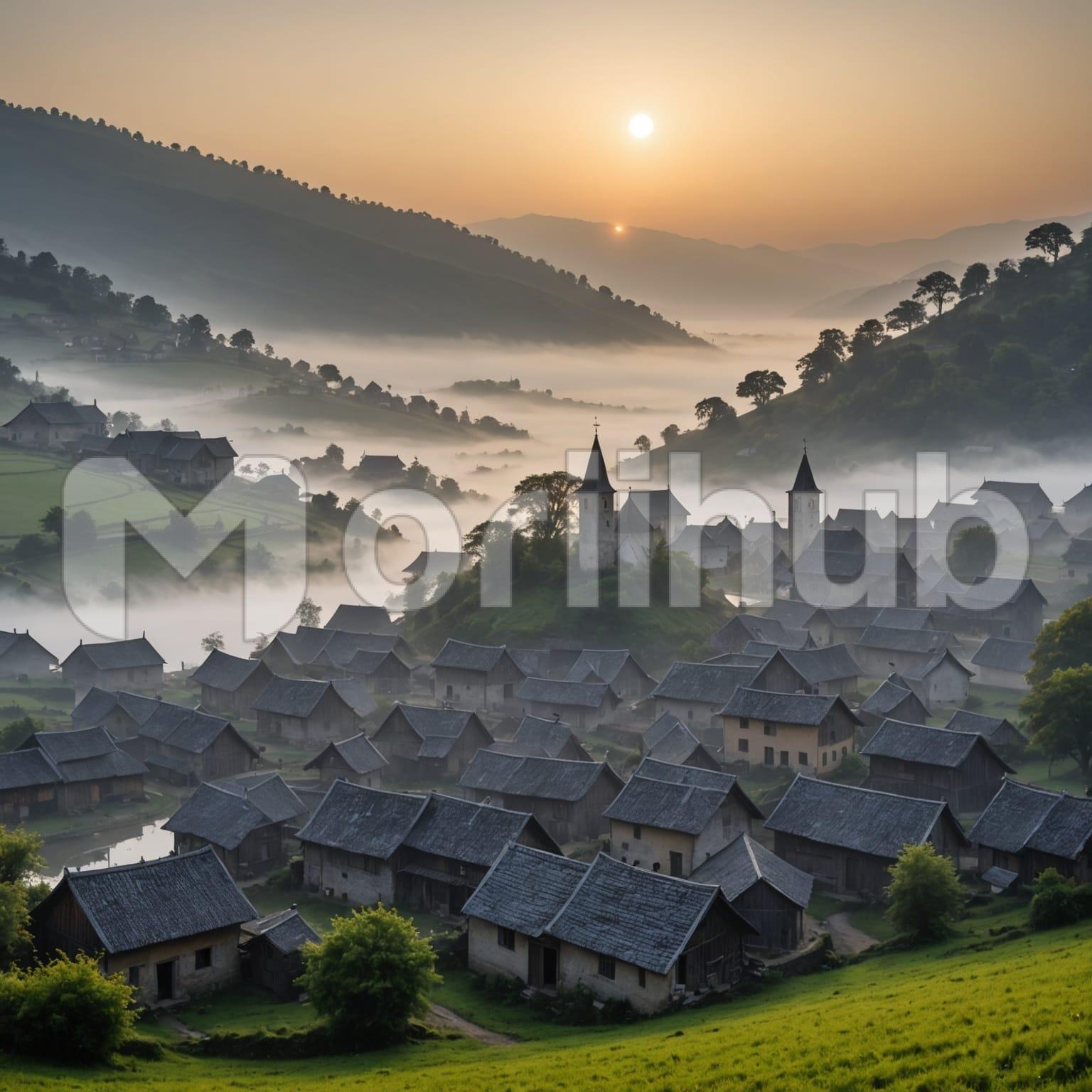 A village lies nestled between rolling slopes, its clustered rooftops forming an orderly pattern across the terrain. Two tall towers rise from the center, marking a focal point amid the tightly grouped buildings. Mist lingers in the low valleys, softening the lines of the distant landscape and partially veiling the view beyond. The hills stretch upward on both sides, dotted with trees that thin toward the ridges. Above it all, the sun hangs low, casting a gentle light that blends the layers of hills, mist, and rooftops into a serene and balanced scene.