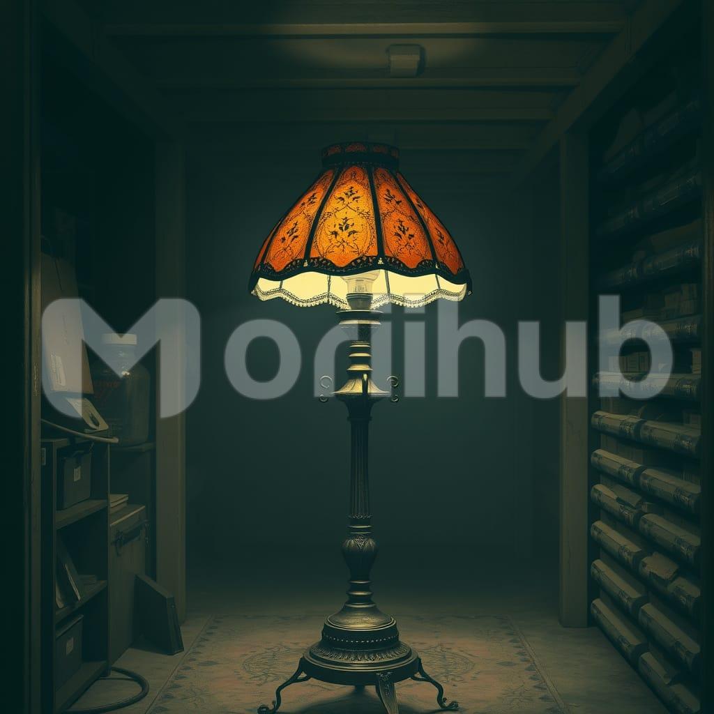 An old lamp casts a soft, warm glow in the darkened room, its vintage design telling stories of the past. The gentle light contrasts with the shadows, creating a nostalgic and intimate atmosphere that invites quiet reflection in the stillness of the night.