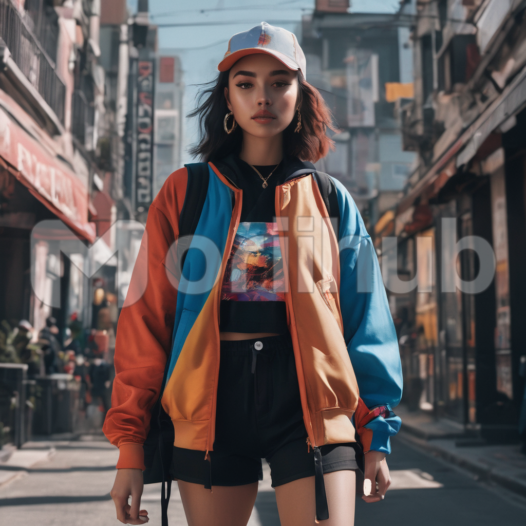 In the urban tapestry, a girl stands confidently, adorned in black shorts and a top that embrace the street’s energy. Her vibrant hoodie bursts with bright hues, a vivid contrast to the monochrome backdrop. A stylish hat crowns her, adding a touch of individuality, while a neckpiece completes the ensemble. Amidst the city’s rhythm, her fashion statement harmonizes with the urban pulse, creating a lively snapshot of self-expression in the dynamic street scene.