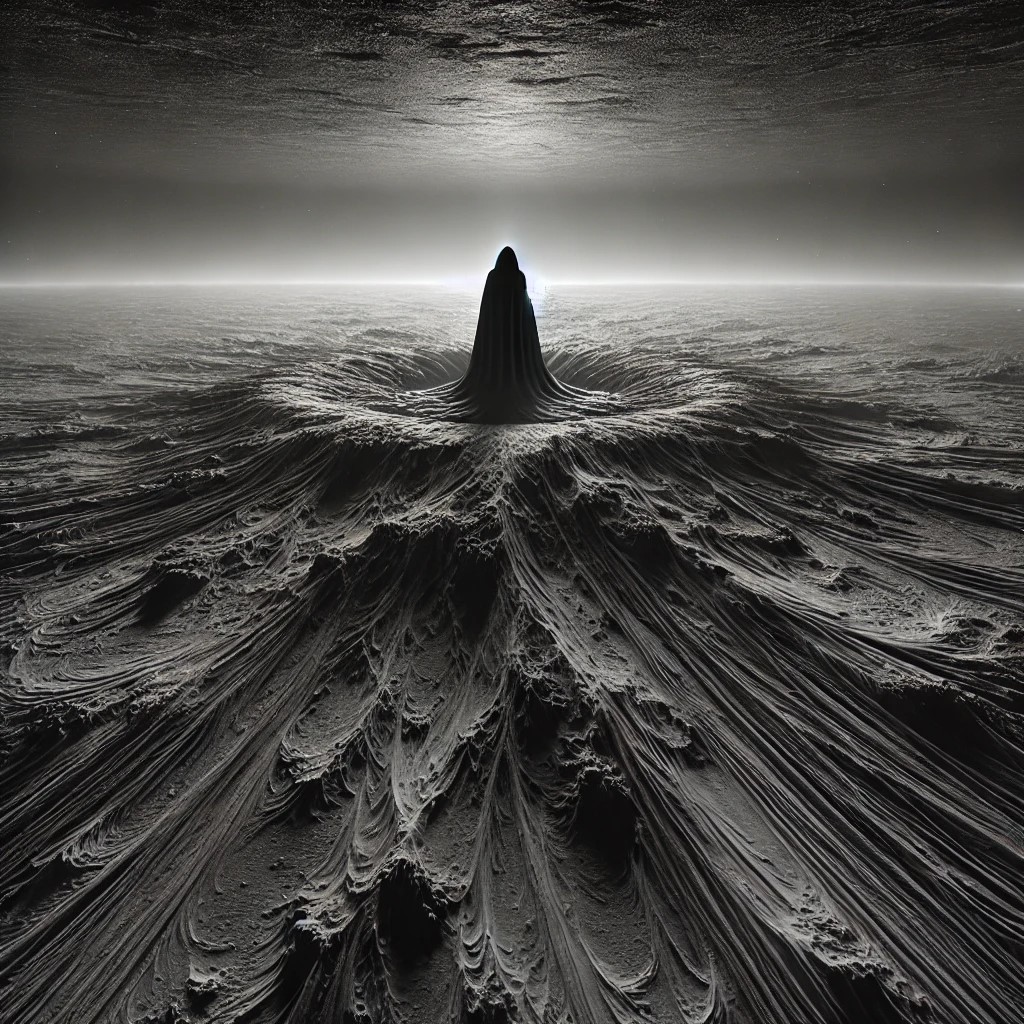 A cloak that seems to be made of the void itself. The cloak is a deep, impenetrable black that absorbs all light and matter around it, creating the impression of a bottomless pit. The edges of the cloak seem to dissolve into the surrounding nothingness, making it difficult to distinguish where the figure ends and the void begins. Occasionally, the cloak ripples, revealing brief glimpses of the emptiness within—vacuums, voids, and the absence of all things.