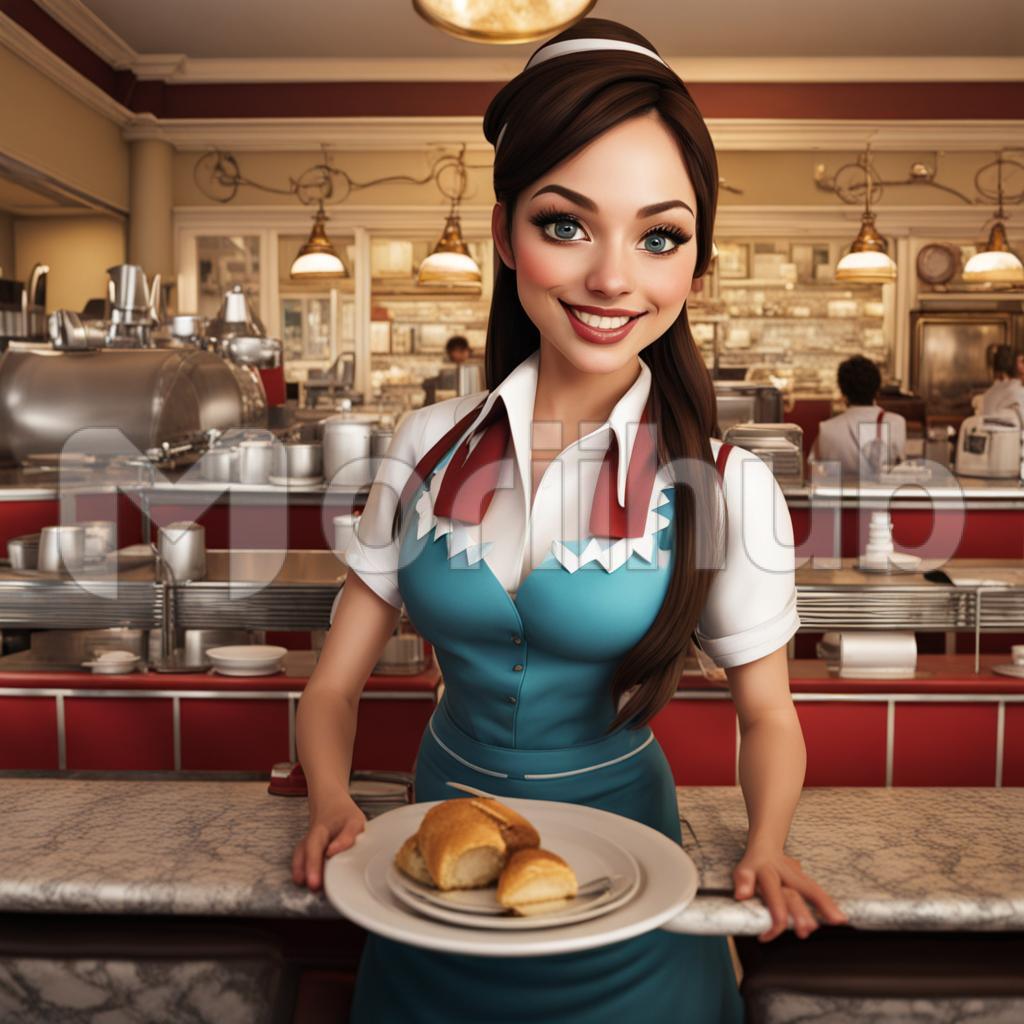 In a luminous painting, a waitress exudes warmth as she serves with a genuine smile. The artist skillfully captures the play of light on her apron, the gleam in her eyes, and the inviting gesture of extending a plate. The color palette harmonizes, creating a visual symphony that celebrates the joy of service, inviting viewers to bask in the ambiance of hospitality with a shared smile.