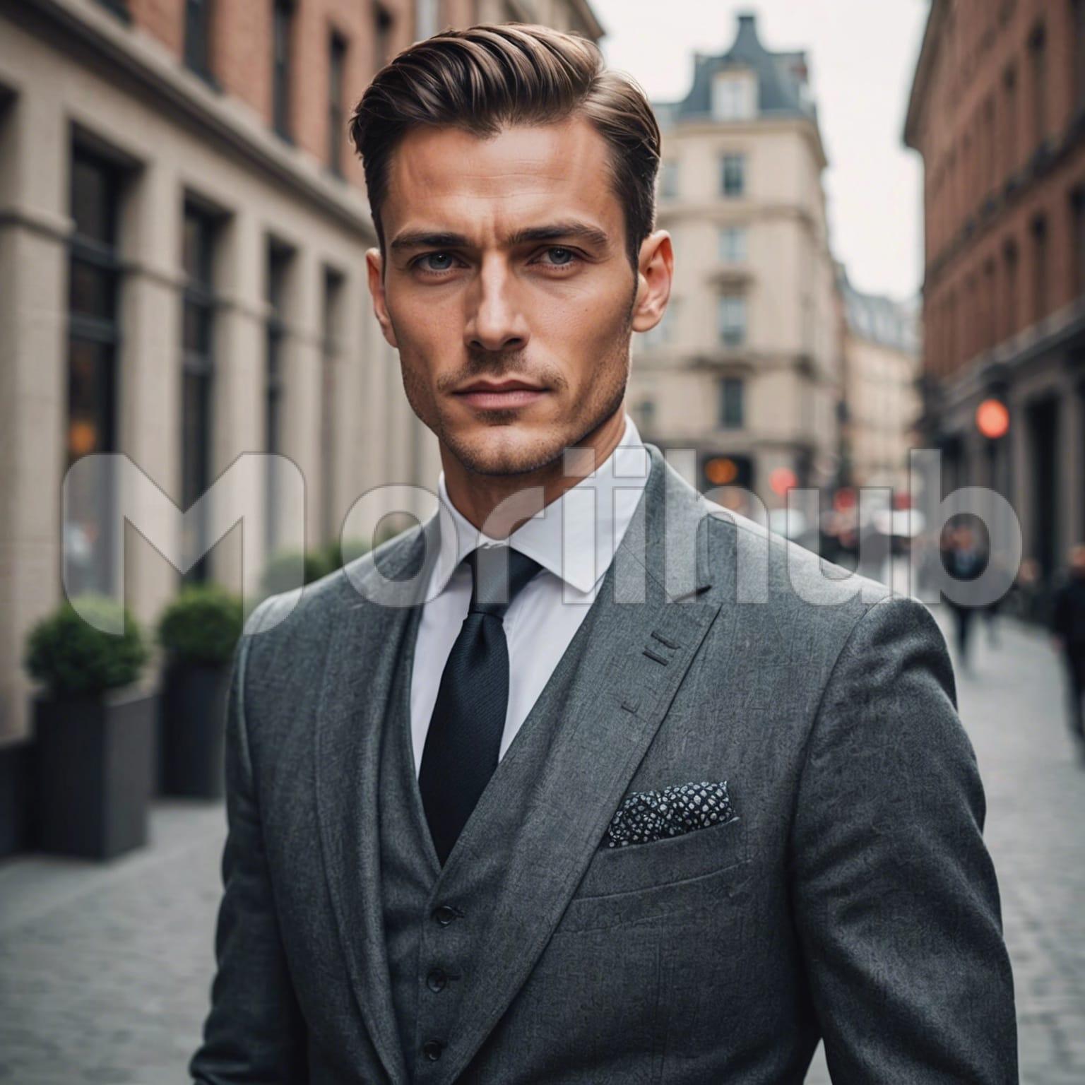 A man in a sharp suit strides confidently down the bustling street, turning heads with his impeccable style. The tailored suit, perfectly fitted, highlights his refined taste and attention to detail. A crisp shirt and a neatly knotted tie add to his polished appearance. With a purposeful gait and a composed expression, he navigates the urban landscape with ease. The lively street scene contrasts with his poised demeanor, making him stand out as a paragon of modern sophistication amidst the city’s dynamic energy.