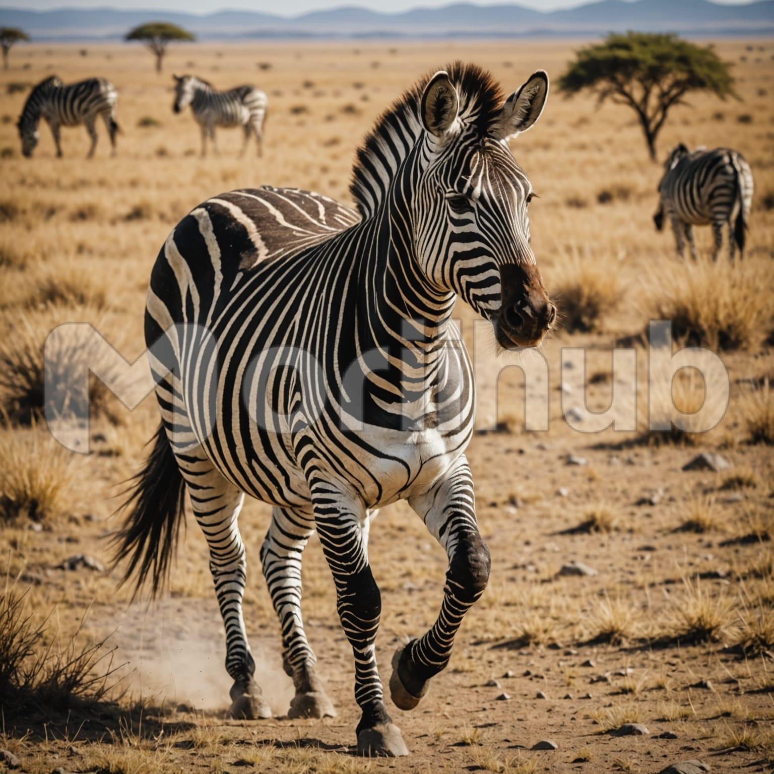 A zebra walks across the savannah, its striped body moving in quiet rhythm with the land. The ground is dry, with scattered patches of grass and low plants breaking the flat expanse. The zebra’s head is level, its steps even, hooves meeting the earth without rush. Its stripes stand out clearly, bold against the muted tones of the surroundings. In the distance, the terrain continues with slight rises and a few scattered trees. The scene remains still aside from the zebra’s movement, calm and steady across the wide, open stretch of land.