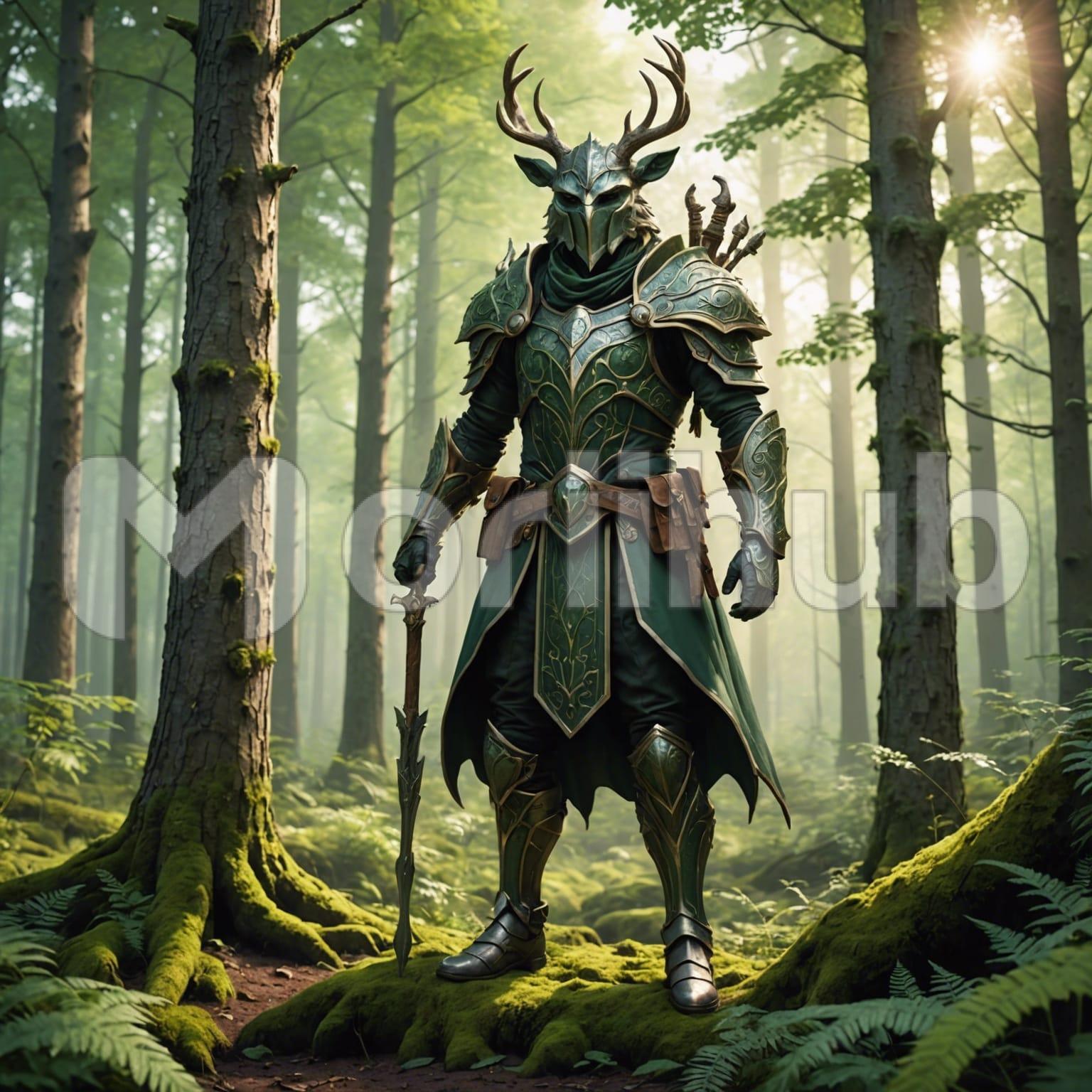 In the heart of the forest, a warrior stood, clad in armor that whispered tales of battles past. With a firm grip, he wielded a gleaming sword, its blade catching the dappled sunlight filtering through the canopy. His armor, a testament to resilience, encased him like a second skin, each piece bearing the scars of honor. Atop his helmet, a deer’s horn was intricately carved, a symbol of his connection to the wild. In this serene sanctuary, he remained vigilant, a guardian sworn to protect the secrets of the woods.