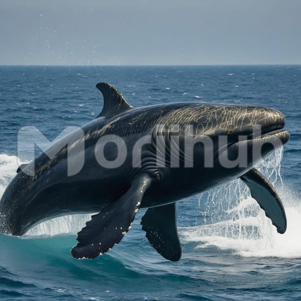 Bold whales leap joyfully across the open sea, their massive bodies breaking the surface with powerful splashes. The ocean sparkles beneath them as they frolic in the waves, their carefree energy radiating through the water. With each graceful dive and joyous breach, they celebrate the freedom of the vast, endless ocean.