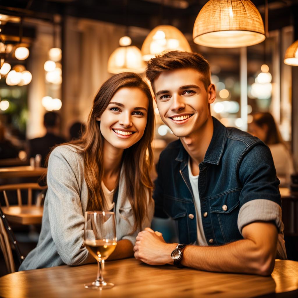 In a cozy corner of a dimly lit restaurant, a teenage couple sits side by side at a small, intimate table. The soft glow of warm lighting creates a romantic ambiance, casting a gentle glow on their casually dressed figures. They share genuine smiles, exchanging glances filled with laughter and connection. The girl’s hair falls in loose waves, and the boy sports a relaxed yet stylish attire. On the table, a single glass of wine glistens in the ambient light, a subtle testament to the special occasion. The air is filled with a mix of delectable aromas as they engage in easy conversation, the restaurant’s murmur providing a pleasant backdrop to their shared moments of joy. Time seems to slow as they savor the simple pleasures of each other’s company, making the evening a memory to be cherished.