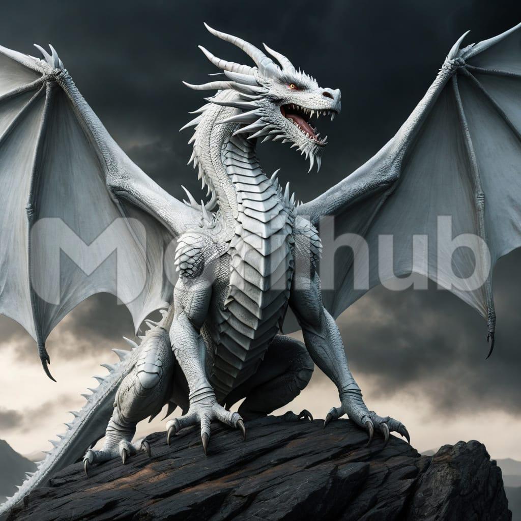 A majestic white dragon soars through the sky, its shimmering scales glowing like snow under the moonlight. With powerful wings and eyes filled with wisdom, it embodies grace and strength. Its presence is both awe-inspiring and serene, as if it holds the secrets of ancient lands within its mystical heart.