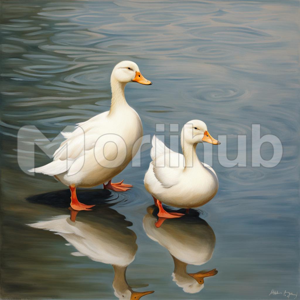 A picturesque tableau unfolds on the tranquil water, where white ducks gracefully glide. Their ethereal plumage reflects in the stillness, creating a serene vision of avian elegance. Ripples form around them as they move with a balletic poise, their presence a study in purity and grace amidst the liquid canvas of nature’s watercolor.