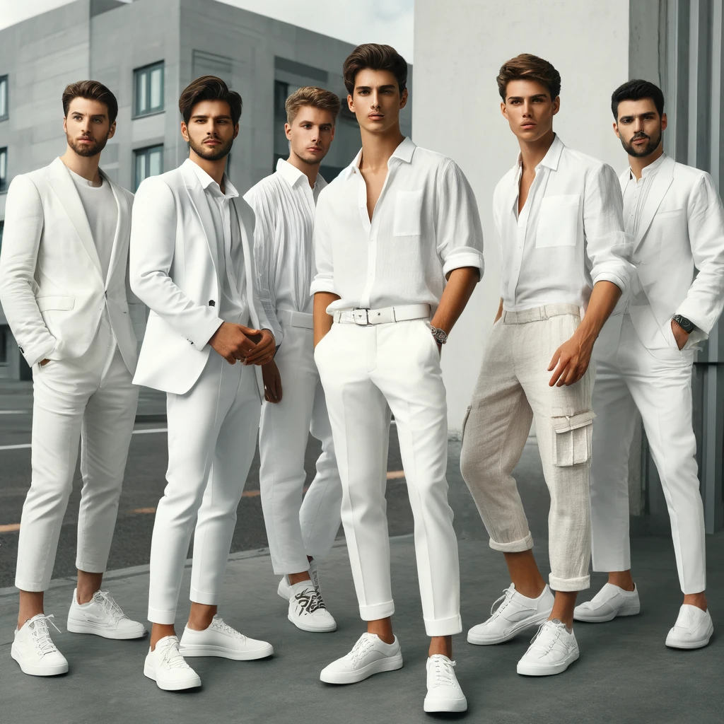 In this chic and modern tableau, a group of men exudes sophistication in an array of stylish white ensembles. Some sport impeccably tailored white suits, radiating elegance and refinement with every step. Others opt for a more casual approach, donning crisp white shirts paired with trousers or jeans, showcasing effortless charm and versatility. Each man’s unique style adds to the collective allure of the scene, epitomizing the timeless appeal of white fashion.