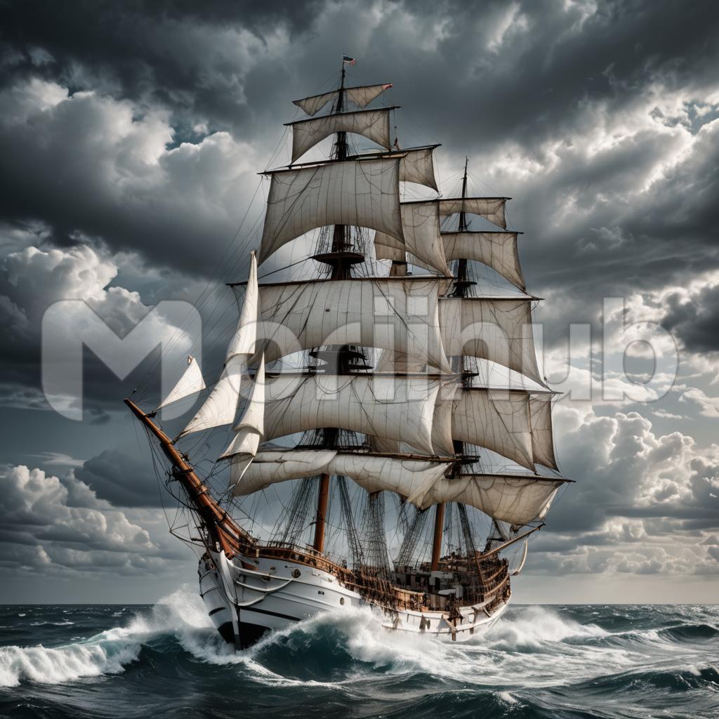 A white ship, its sails billowing in the wind, embarks on a voyage across the boundless sea. As it glides over the waves, it carries dreams of discovery and tales of adventure. Against the backdrop of the horizon, it symbolizes the indomitable spirit of exploration and the allure of distant shores.