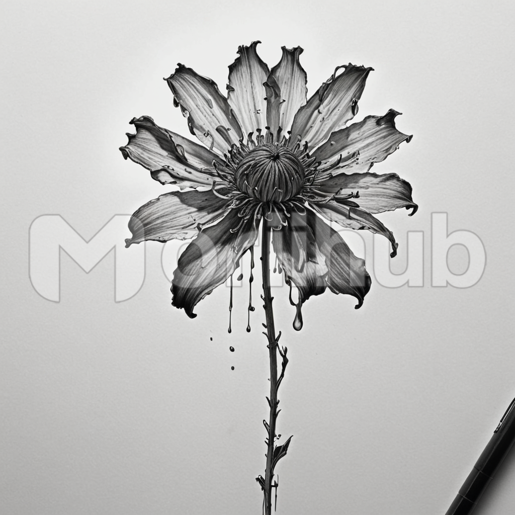 In the depths of the canvas, an ink painting portrays the solemn beauty of a wilted flower. Each delicate petal droops with graceful resignation, their vibrant colors muted to shades of sorrow. The stem, once proud and sturdy, now bows under the weight of time and decay. Despite its faded glory, the flower exudes a quiet dignity, a reminder of the transient nature of life’s beauty. In this poignant depiction, the wilted bloom stands as a solemn testament to the inevitability of change and the fleetingness of all things.