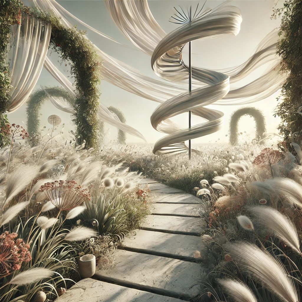 A serene Wind Garden, where nature seems to be in constant, gentle motion. The garden is filled with plants that sway softly in the breeze, their leaves and petals fluttering as if alive. Tall, wispy grasses create a ripple effect, reminiscent of waves in the ocean, while delicate flowers with flowing petals appear almost weightless, floating on the wind. The pathways, made of smooth, white stones, seem to hover just above the ground, leading through arches crafted from woven vines and fluttering ribbons.