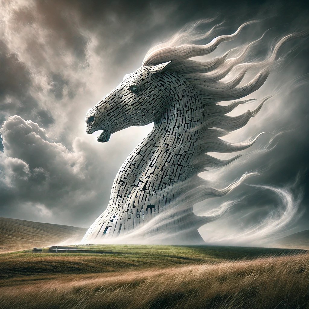 The image captures a majestic wind horse totem set in a vast, open plain with gently rolling hills. Carved from smooth, pale stone, the totem resembles a powerful horse rearing up, with its mane and tail appearing to swirl as though formed from gusts of wind. The totem has a translucent quality, blending seamlessly with the mist and clouds that drift around it, creating a sense of lightness and ethereal presence. White and silver wisps of wind twist and dance around the totem, conveying a dynamic sense of movement.