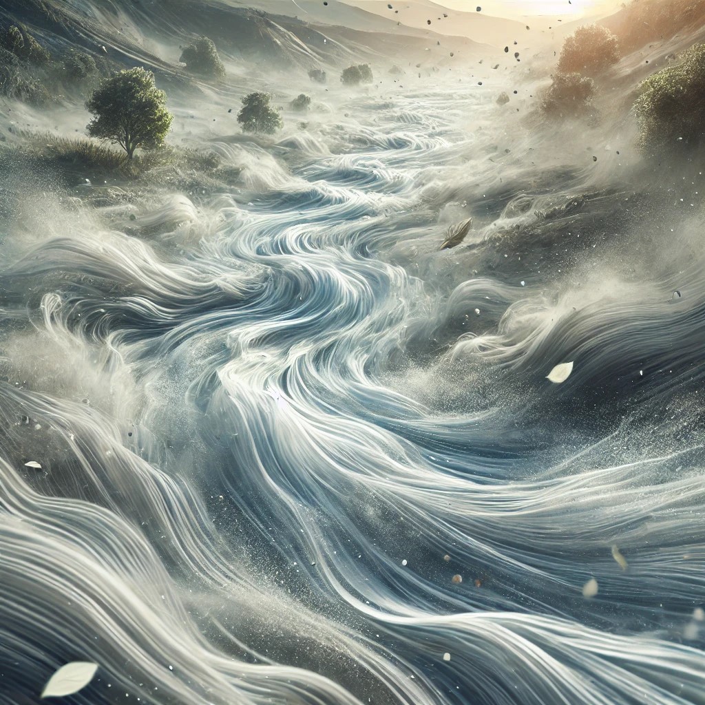 River flows not with water, but with currents of wind. The river has a transparent, swirling appearance, with gusts of wind carrying leaves, dust and light particles. The air shimmers in soft tones of gray, light blue, and white, as if the wind itself is alive and in motion. The surrounding landscape features trees and grass bending in the direction of the wind, creating a dynamic, breezy atmosphere.