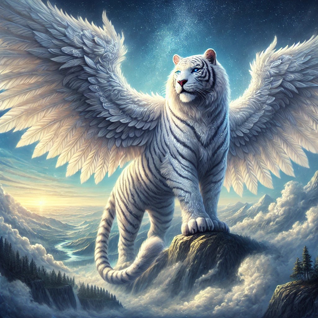 A winged white tiger god, a majestic and divine creature that embodies both grace and power. Its fur is pure white, shimmering with a celestial glow, and its stripes are a soft, silvery hue, adding to its ethereal appearance. The tiger is massive, with a muscular build that exudes strength and authority.