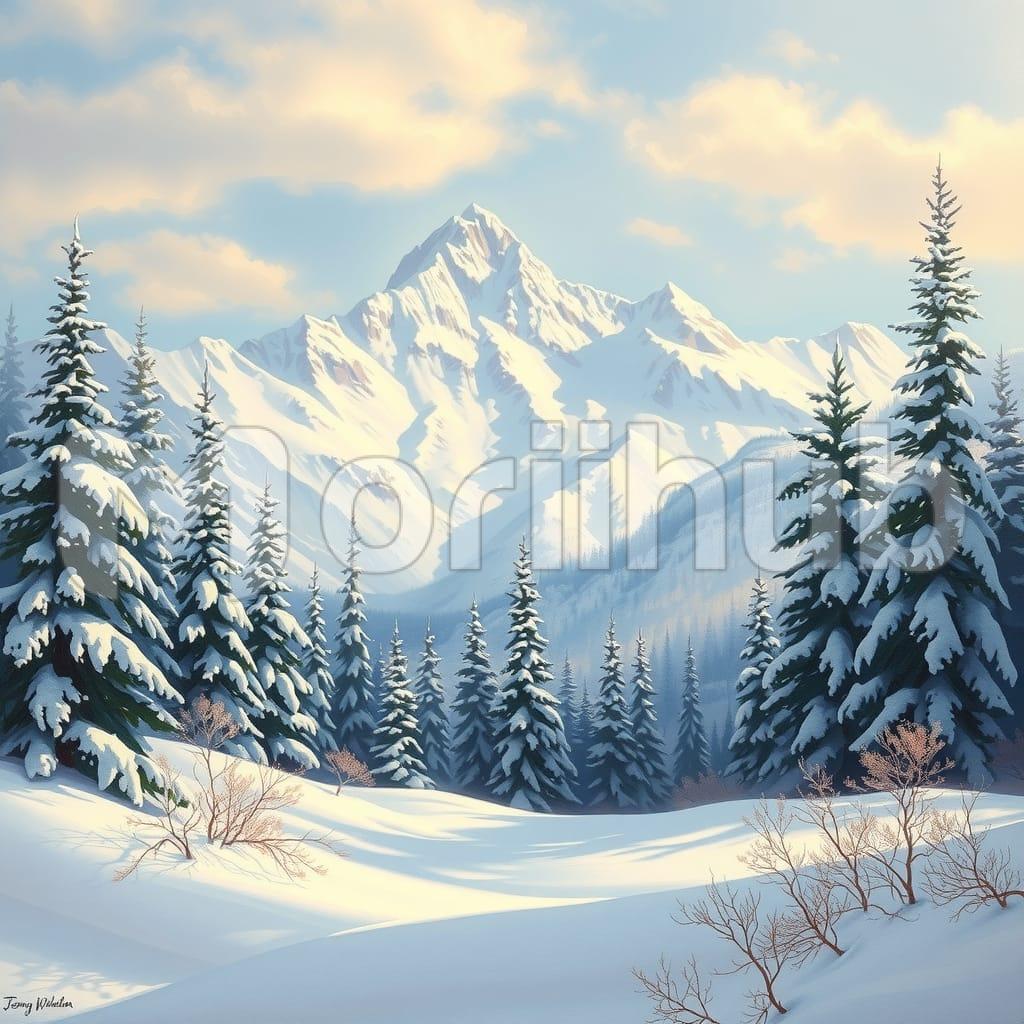Snow-covered trees stand silently, their branches heavy with a thick layer of snow, creating a serene winter landscape. The trees line the foreground, their forms softened by the blanket of white that covers them. In the distance, a majestic mountain rises, its peaks also cloaked in snow, blending seamlessly with the pale sky above. The mountain stands tall and imposing, a symbol of nature’s grandeur, while the snow-covered trees add a touch of quiet beauty to the scene. The entire view evokes a sense of calm and timelessness.