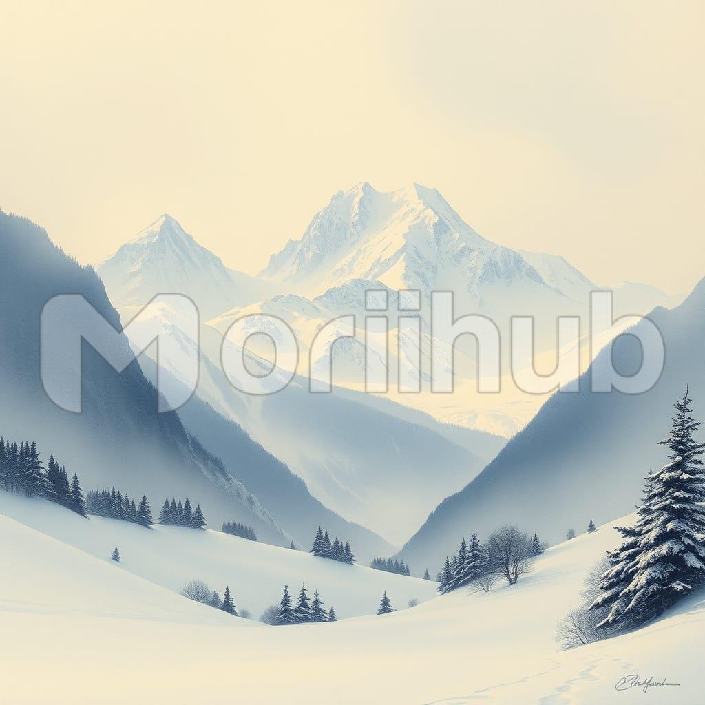 A wide stretch of snowy terrain extends toward the horizon, its surface quiet and undisturbed. In the distance, snow-capped mountains rise sharply, their ridges outlined beneath the pale light. The ground closer holds faint unevenness, shaped by wind and the natural lay of the land. Sparse trees stand scattered, dusted with snow, their forms adding depth to the scene. The sky above remains clear, casting a soft glow across the landscape. The air appears still, and the entire view rests in a quiet balance between rugged form and frozen stillness.