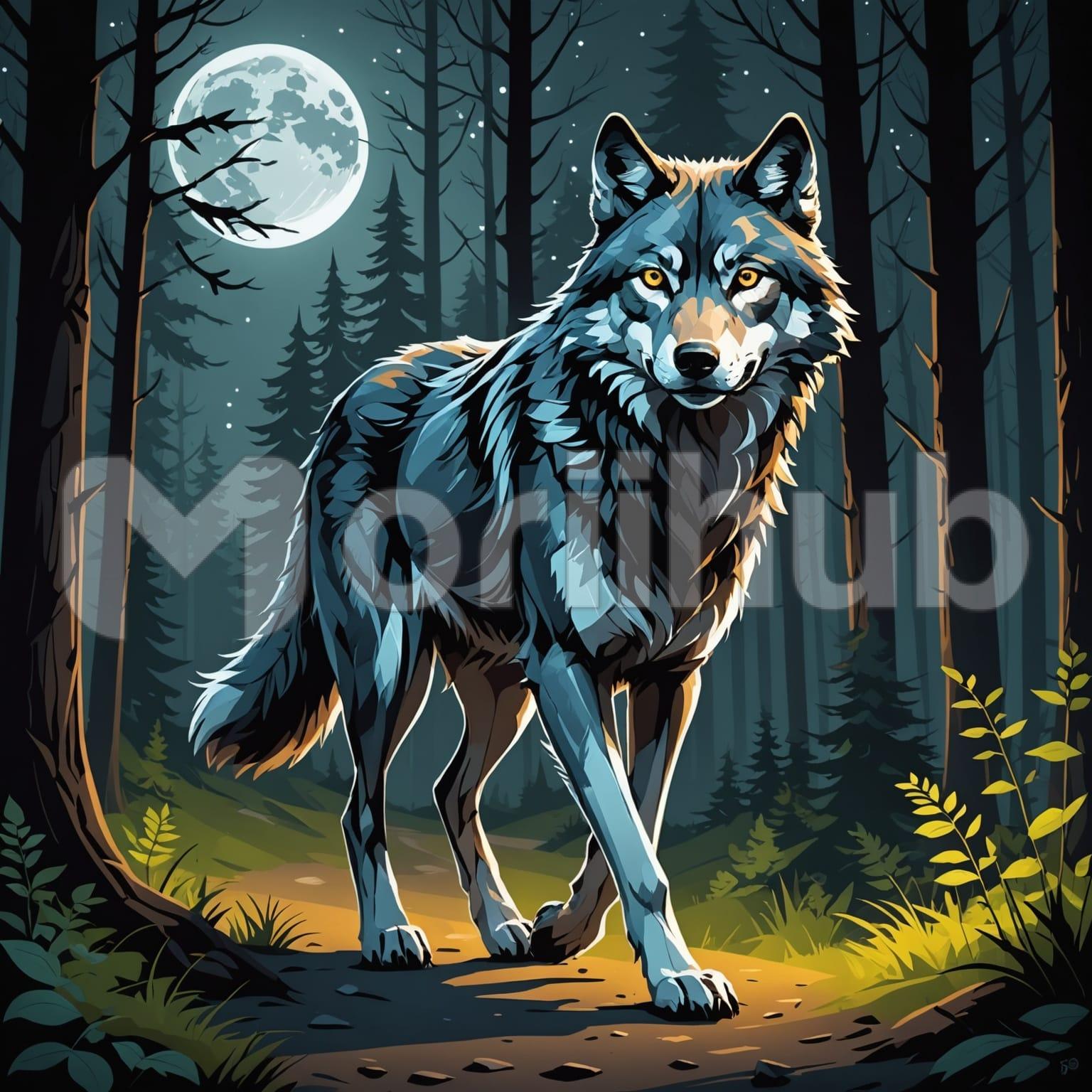 A cartoon portrayal shows a wolf walking through the woods, its body drawn with clean lines and simple shading. The trees stand in stylized rows, their forms reduced to essential shapes, leaving the focus on the lone figure moving between them. The wolf’s posture is steady, its head forward, tail following. Sparse patches of ground cover break up the forest floor. Above, the moon appears in a clear sky, round and prominent, offering a quiet balance to the scene. The setting feels calm and focused, with the wolf central to the quiet moment.
